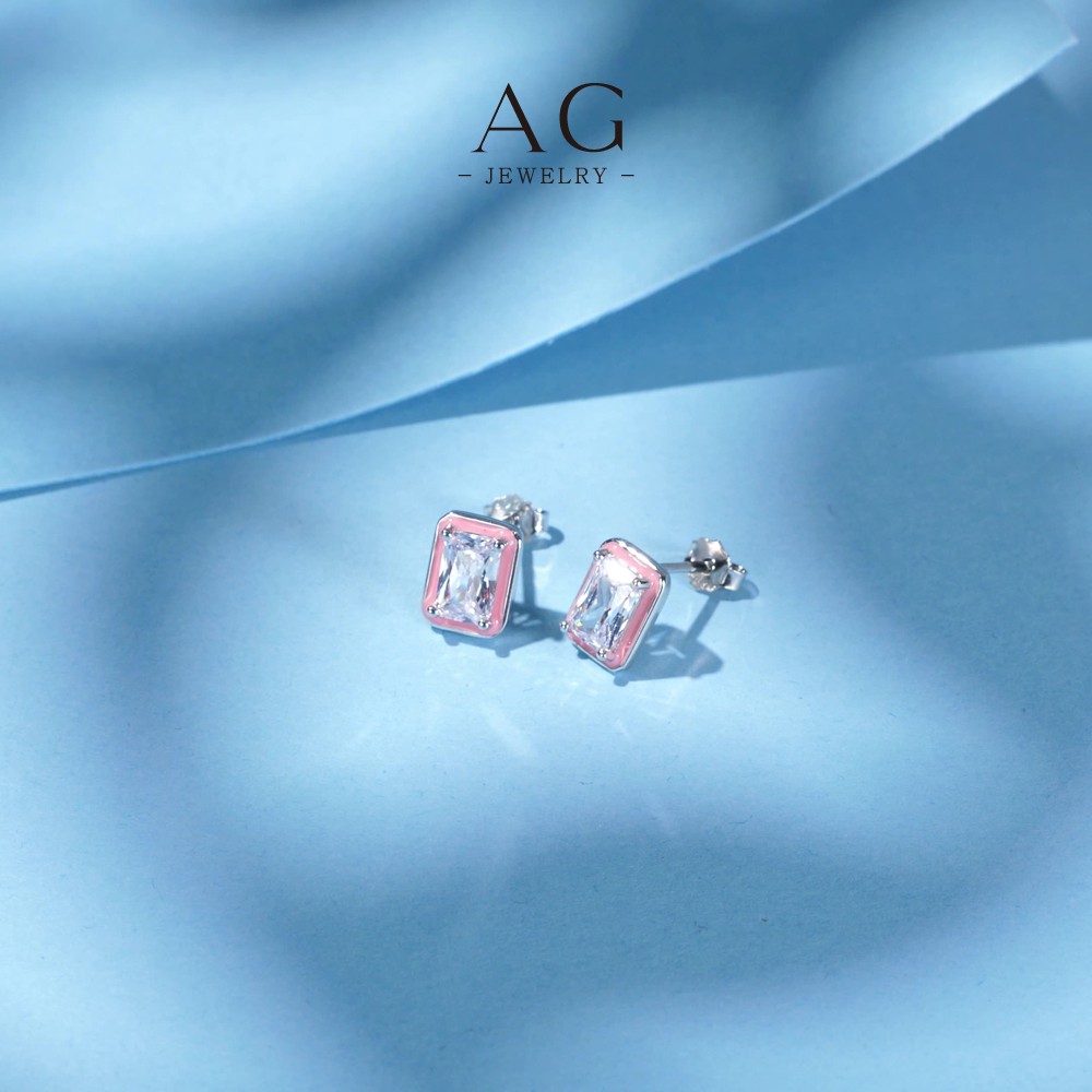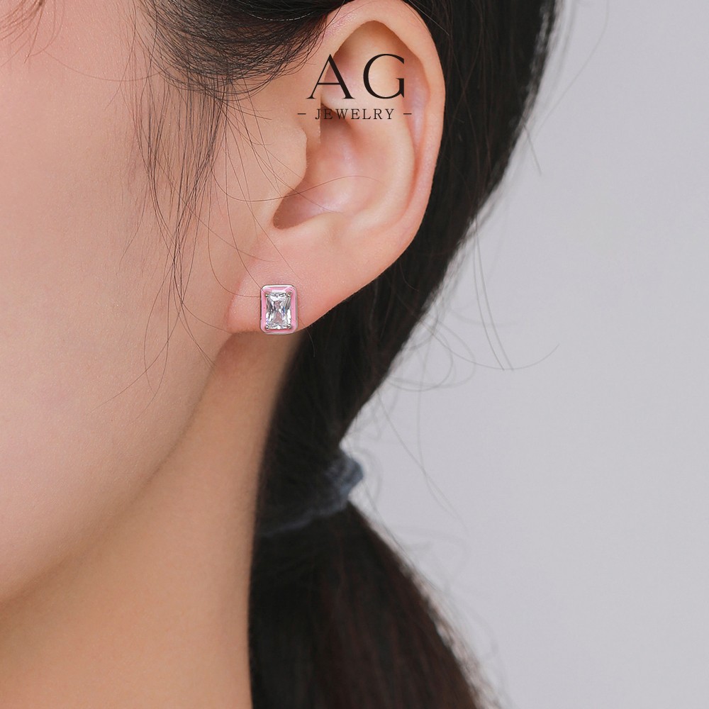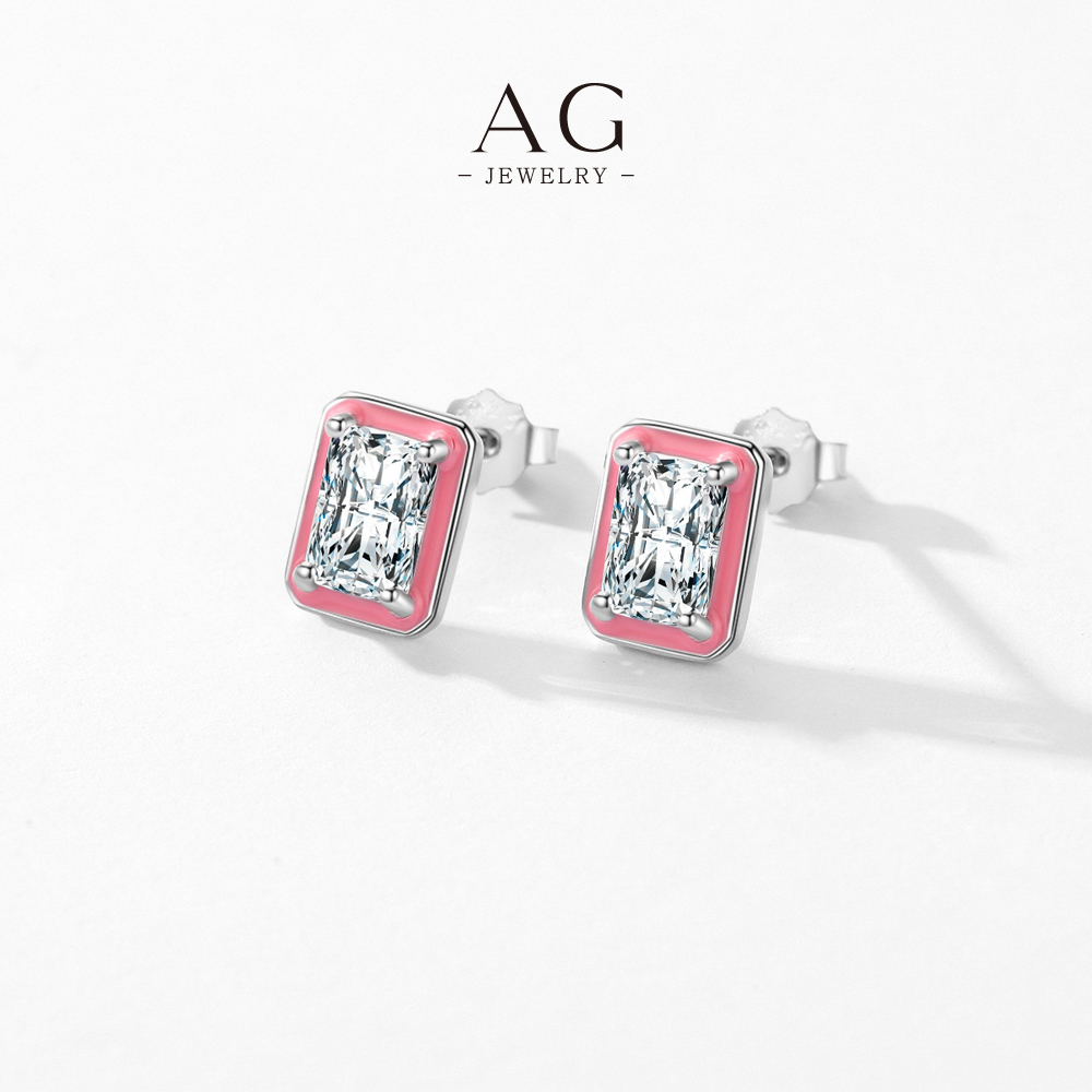 AG Pink Enamel Square Zircon Stud Earrings 925 Silver Plated Preppy Style Jewelry AGRHE1303