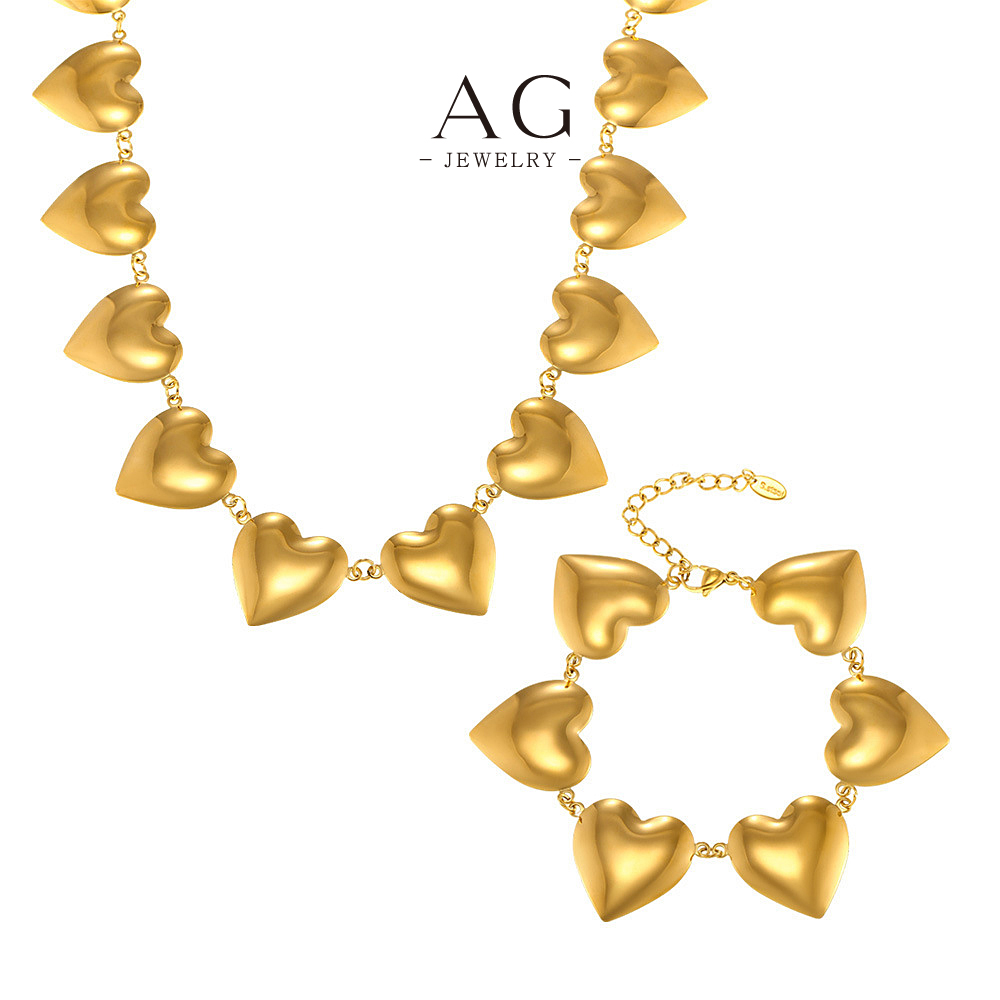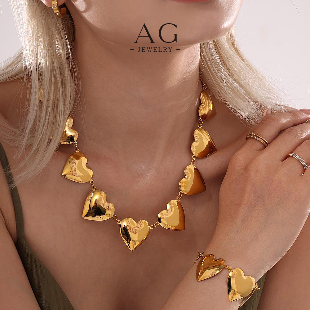 AG Hollow Mirror Heart Jewelry Set Gold Accent Necklace Bracelet Earrings AGTXP227