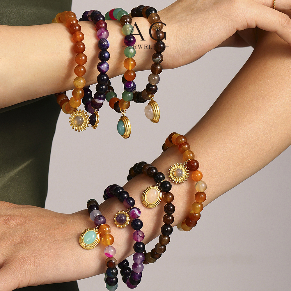 AG Stainless Steel Natural Stone Pendant Bracelet Quartz Tiger Eye Strawberry Quartz Collection AGE654