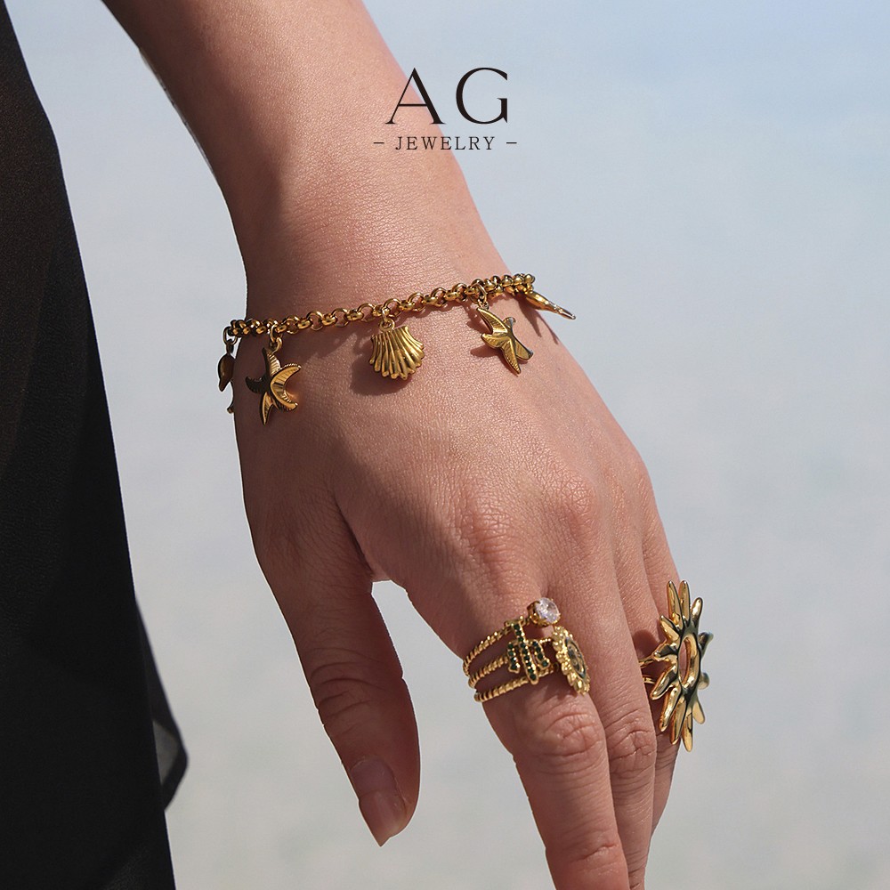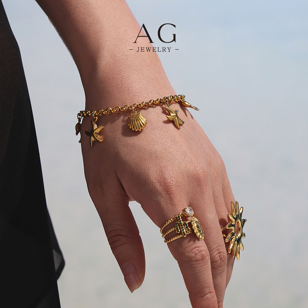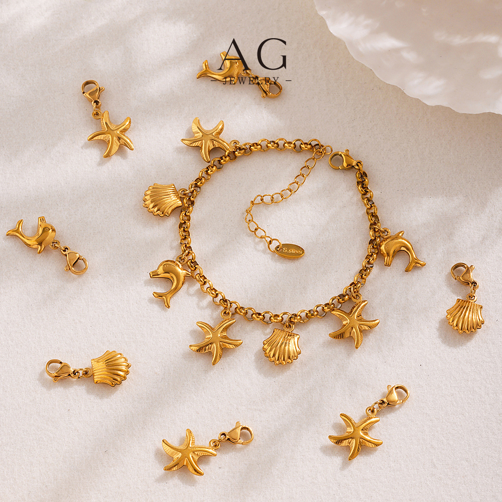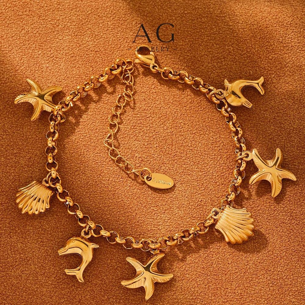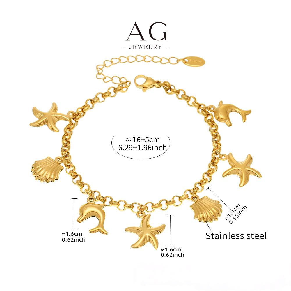 AG Stainless Steel Heart Shell Dolphin Charm Bracelet Ocean Theme Jewelry AGE634